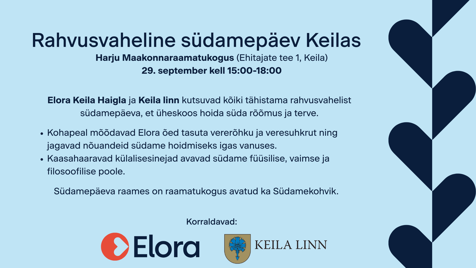 Elora Keila Haigla ja Keila Linn kutsuvad kõiki kogukonna liikmeid tähistama Rahvusvahelist südamepäeva. Kohapeal mõõdavad Elora õed tasuta vererõhku ja