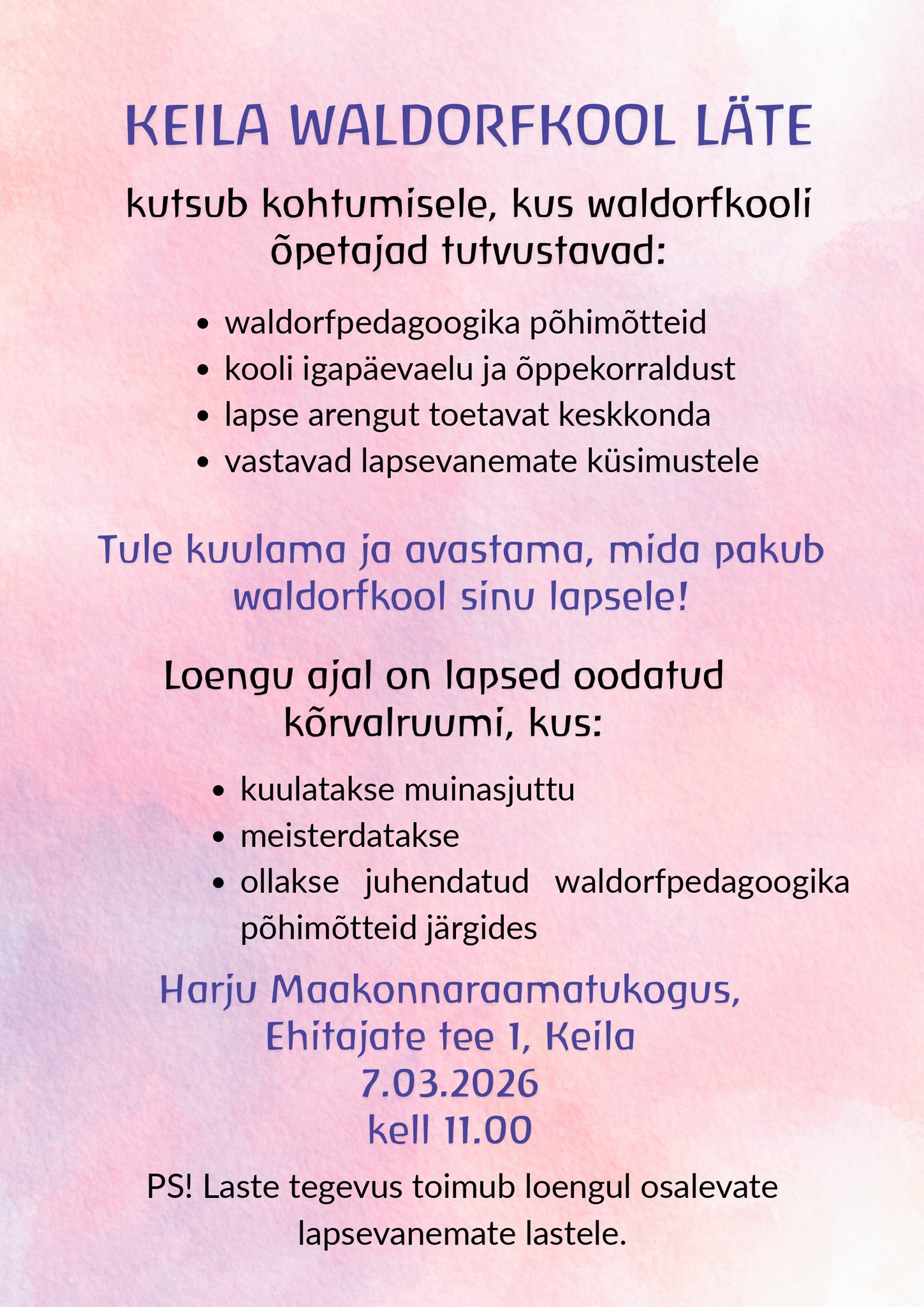 Laupäeval, 7. märtsil algusega kell 11.00 toimub Harju Maakonnaraamatukogus Keila Waldorfkool Läte korraldatud kohtumine. Lapsevanematele toimuvad loengud ning lapsed saavad