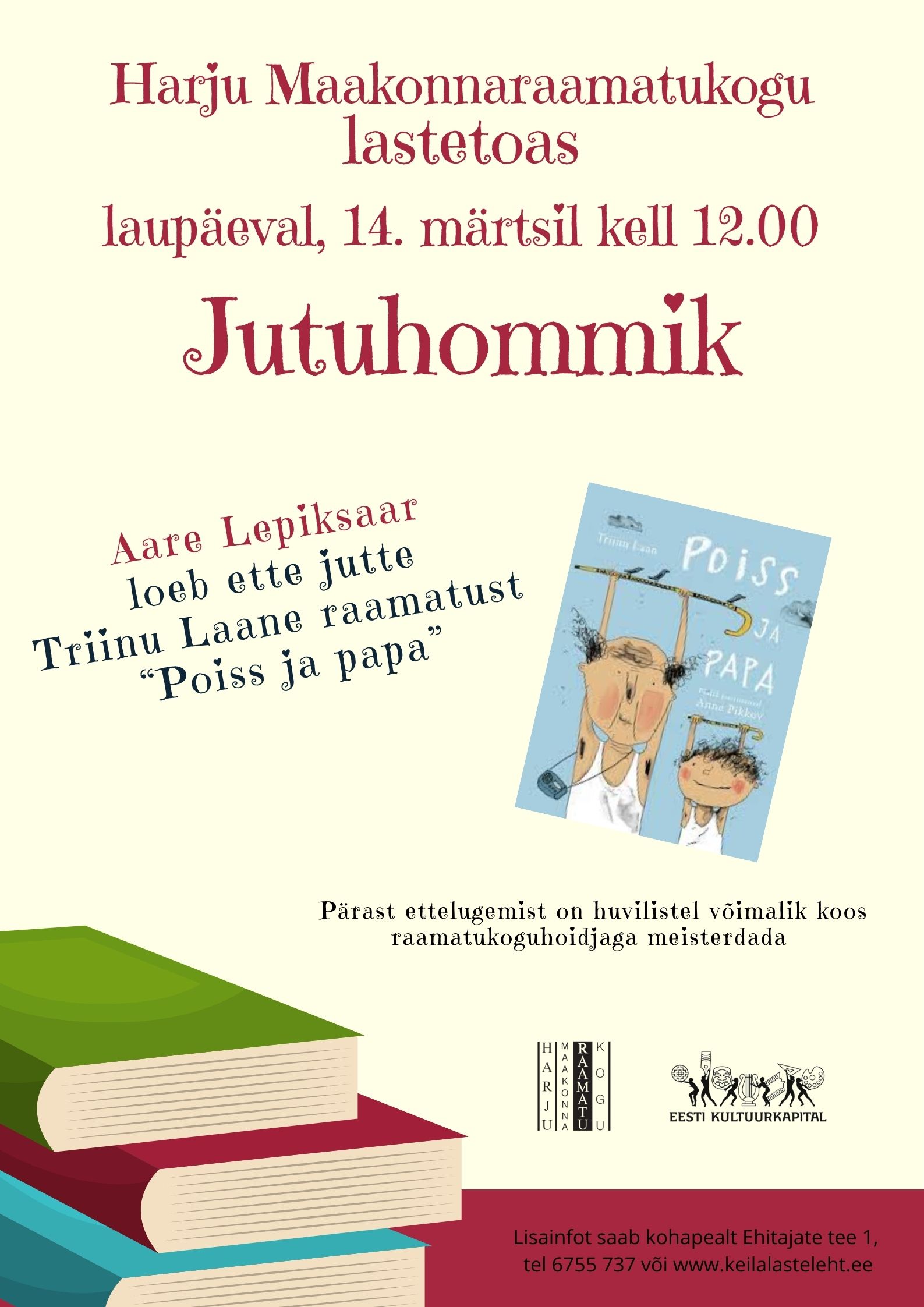 Emakeelepäeva Jutuhommikul kuulete Aare Lepiksaare esituses jutte Triinu Laane raamatust “Poiss ja papa”. Peale ettelugemist on huvilistel võimalik koos raamatukoguhoidjaga
