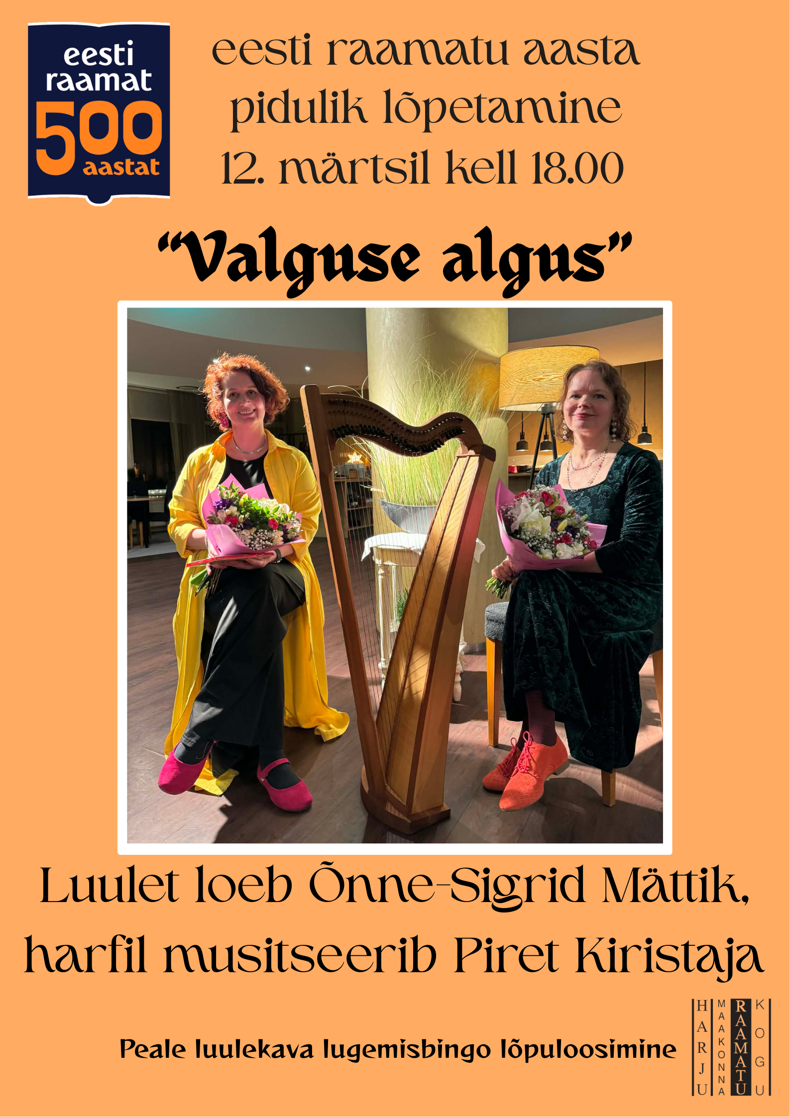 Neljapäeval, 12. märtsil algusega kell 18:00 toimub Harju Maakonnaraamatukogus eesti raamatu aasta pidulik lõpetamine. Luulet loeb Õnne-Sigrid Mättik, harfil musitseerib