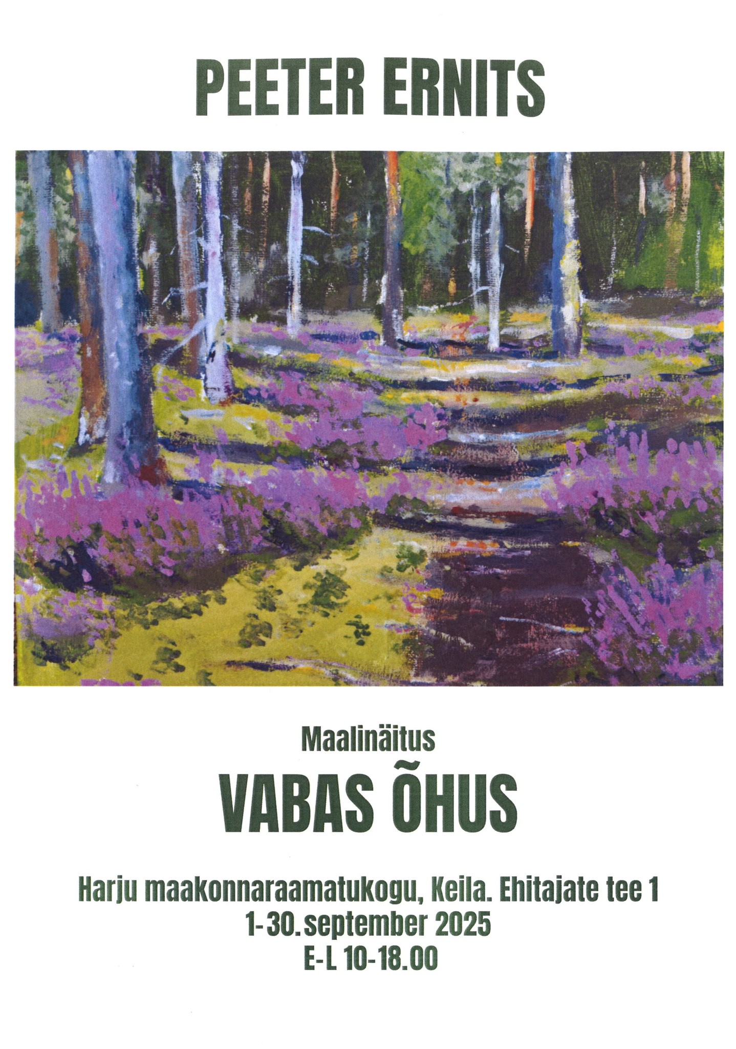 Raamatukogu Oranžil seinal on Peeter Ernitsa maalinäitus Vabas õhus. Näitus on avatud 01.09.- 30.09.2025.