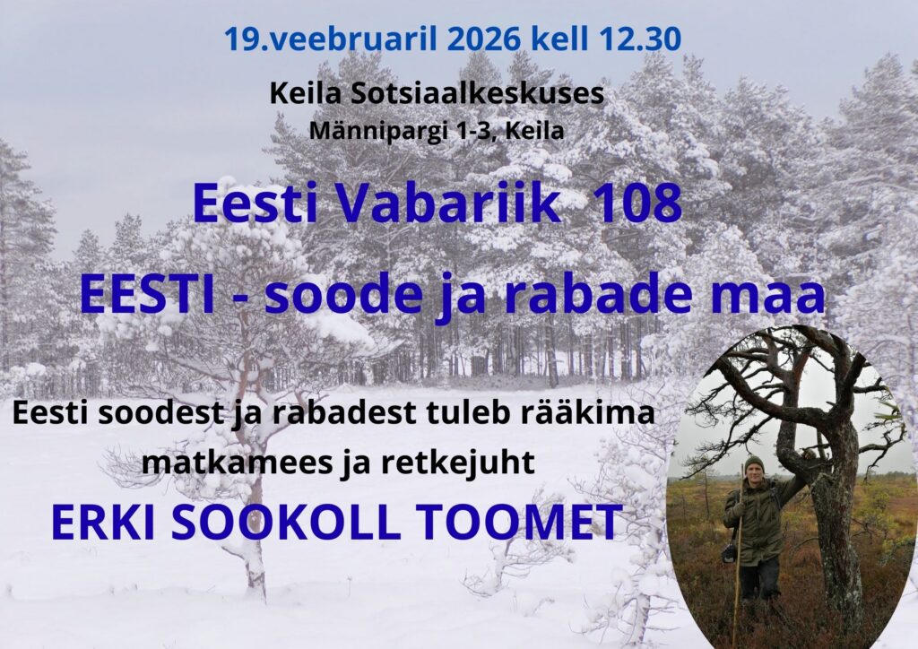 Keila Sotsiaalkeskuses tähistatakse Eesti Vabariigi 108 aastapäeva juba 19.veebruaril 2026 kell 12.30. Seekord on teema “Eesti – soode ja rabade maa” Juttu tuleb rabamaastikel liikumisest, soode taastamisest ja soorauamaagiast. Oma tutvusest soode ja rabadega räägib ja näitab pilte matkamees ja retkejuht Erki Sookoll Toomet