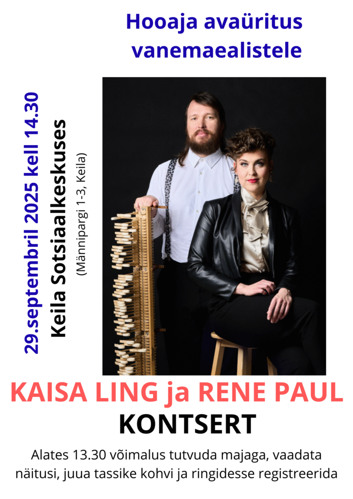 Kohtumiseni Keila Spotsiaalkeskuses! Märksõna “vanemaealised” võib vabalt tõlgendada! Kontsert on tasuta!