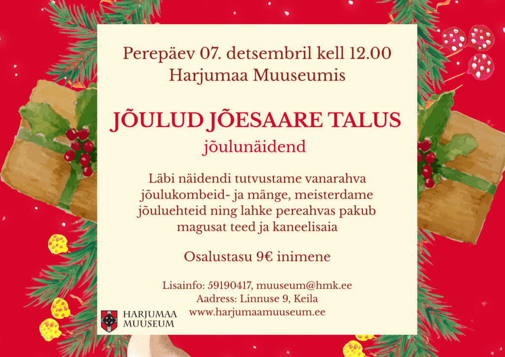 Tule osa saama toredast perepäevast, kus läbi näidendi tutvustame vanu- ja uusi jõulukombeid. Külla tuleb heasüdamlik hingeke, kohal on mamma ja lapselaps. Mängime vanu mänge, laulame kuusepuule ja sööme kaneelisaia ja joome magusat teed. Meisterdame jõuluehteid. Osalustasu 9€ inimene.