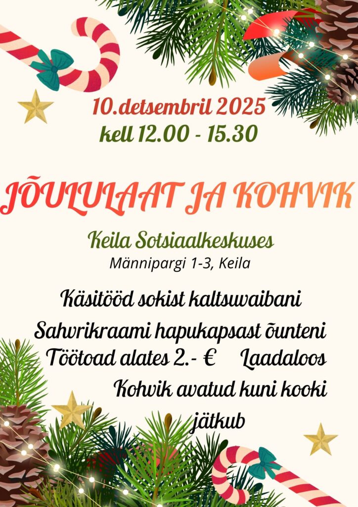 Keila Sotsiaalkeskuse jõululaat ja kohvik toimub sel aastal 10.detsembril 2025 kell 12.00 – 15.30. Jõulusündmus toimub kahel korrusel: esimesel korrusel traditsiooniliselt Rebase talu õunad ja Mesioja mesi, MTÜ Töötahe vaipade müük ja kohvik, teisel korrusel käsitöölaat ja erinevad töötoad, töötubade maksumus alates 2-eurost. Jälgi reklaami Keila Sotsiaalkeskuse FB-st. Lisainfo tiiu@keilasots.ee, telefon 524 7284