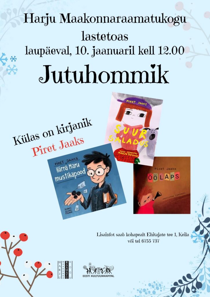 Aasta esimesele Jutuhommikule tuleb kirjanik Piret Jaaks. Suurepärane võimalus kohtuda kirjanikuga, kes on kirjutanud lastele mitmeid väärt raamatuid. Kindlasti loeb ta mõnda neist meile ka ette.